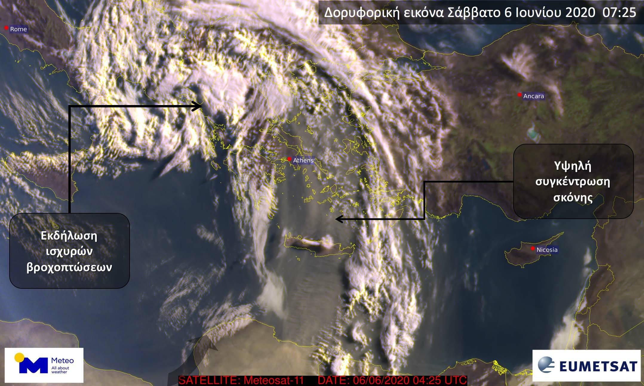 Σύμφωνα με το meteo του Εθνικού Αστεροσκοπείου Αθηνών, οι πυκνές νεφώσεις στα κεντρικά και βόρεια τμήματα προκαλούν τοπικά ισχυρές βροχοπτώσεις, ενώ στη νότια Ελλάδα τα κύρια χαρακτηριστικά είναι η αυξημένη συγκέντρωση αφρικανικής σκόνης και τα χαμηλά ποσά υγρασίας.