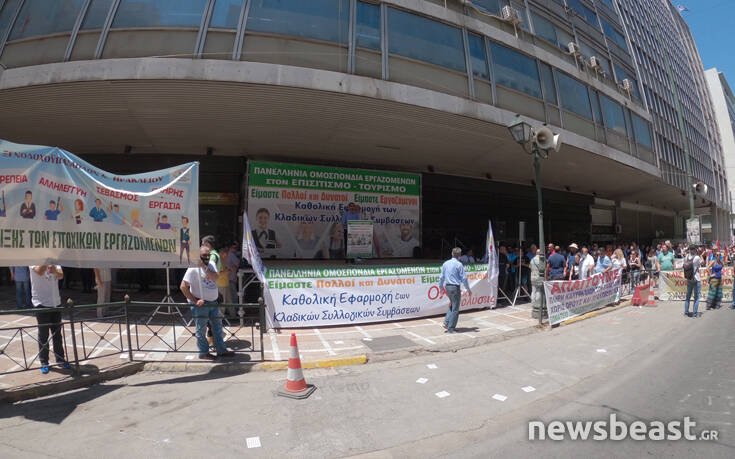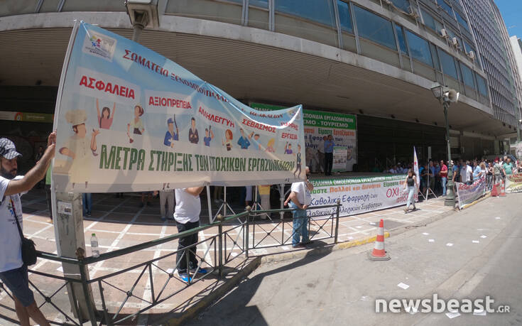 Νωρίτερα οι εργαζόμενοι είχαν συγκεντρωθεί έξω από το υπουργείο Εργασίας, αντιδρώντας στα προβλήματα που αντιμετωπίζει ο κλάδος από το lockdοwn που είχε επιβάλλει ο κορονοϊός. «Είμαστε πολλοί και δυνατοί, είμαστε εργαζόμενοι, όχι στις απολύσεις» γράφει ένα από τα πανό.
