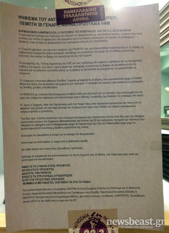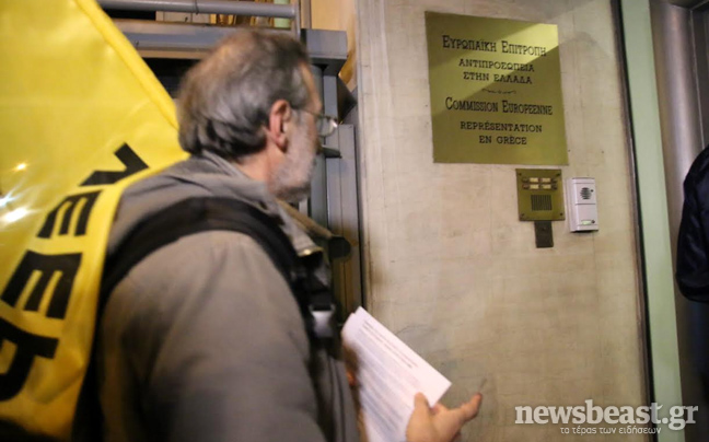Κατά την άφιξή τους στα γραφεία της Ε.Ε. οι διαδηλωτές θυροκόλλησαν ψήφισμα διαμαρτυρίας.