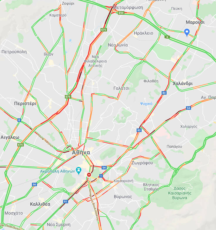 Σύμφωνα με την τελευταία ενημέρωση της Τροχαίας πολύ χαμηλές είναι οι ταχύτητες στο κέντρο της πόλης, κυρίως στην Αμαλίας, την Πανεπιστημίου και τη Λεωφόρο Συγγρού.