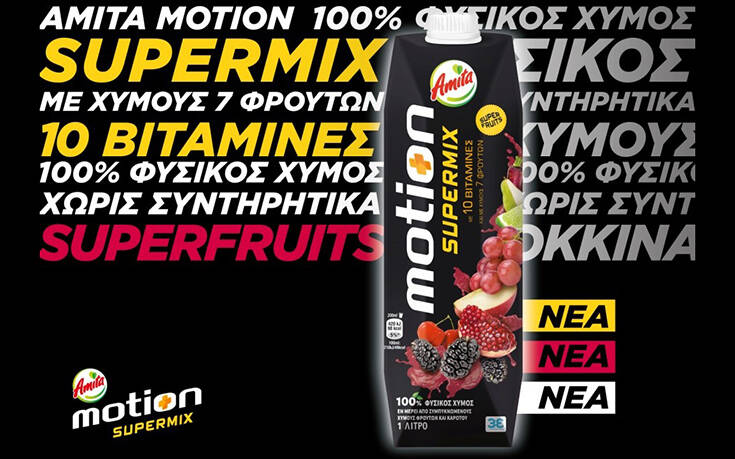 Mε 10 βιταμίνες κι ένα συνδυασμό φρούτων που ξεχωρίζει, η Amita Motion Supermix είναι πλέον το άλλο «μισό» της δημοφιλέστερης μάρκας χυμού. O νέος 100% φυσικός χυμός χωρίς συντηρητικά, αποτελείται από ένα μοναδικό συνδυασμό 7 φρούτων & 10 βιταμινών που ενισχύει τα επίπεδα της ενέργειας σου καθημερινά. Παράλληλα, τα superfruits ρόδι, ασερόλα & μαύρο μούρο είναι πλούσια σε αντιοξειδωτικές ουσίες και θρεπτικά συστατικά, χαρίζοντάς σου μία μοναδική γευστική εμπειρία. To μαύρο χρώμα κυριαρχεί στις συσκευασίες 1lt & 330ml της Amita Motion Supermix, αναδεικνύοντας το μοντέρνο & δυναμικό χαρακτήρα του προϊόντος.