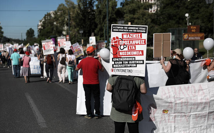 Κρατώντας μαύρα και λευκά μπαλόνια κατευθύνονται προς το υπουργείο Υγείας οι υγειονομικοί καθώς σήμερα η Ομοσπονδία Ενώσεων Νοσοκομειακών Γιατρών Ελλάδας (ΟΕΝΓΕ) έχει προχωρήσει σε 24ωρη απεργία διεκδικώντας την επίλυση οικονομικών και θεσμικών αιτημάτων. Οι υγειονομικοί είχαν αρχικά συγκεντρωθεί στην πλατεία Μαβίλη.