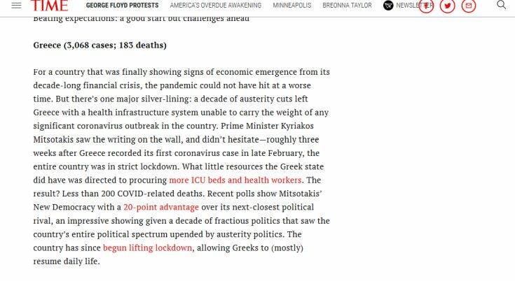 Στο δημοσιεύμα η Ελλάδα παρουσιάζεται ως η «εκπρόσωπος της Ευρώπης» μιας και με 3.068 κρούσματα και 183 θανάτους (σς από τη δημοσίευση του άρθρου έχουν καταγραφεί αλλοι δύο θάνατοί στην Ελλάδα), είναι στην εμπροσθοφυλακή των χωρών που ανταπεξήλθαν στην πανδημία.