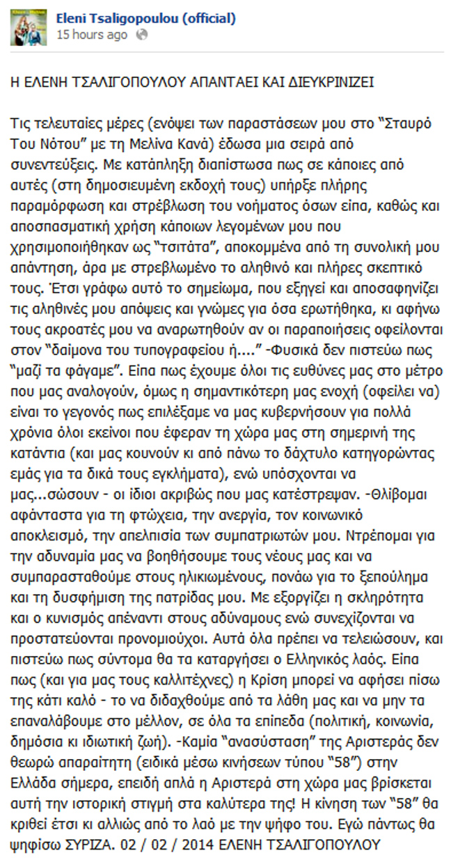 Με μήνυμά της στο Facebook η Ελένη Τσαλιγοπούλου καταγγέλλει «πλήρη παραμόρφωση και στρέβλωση» του νοήματος όσων είπε σε συνέντευξή της και αποσαφηνίζει τις απόψεις της για όσα ερωτήθηκε.