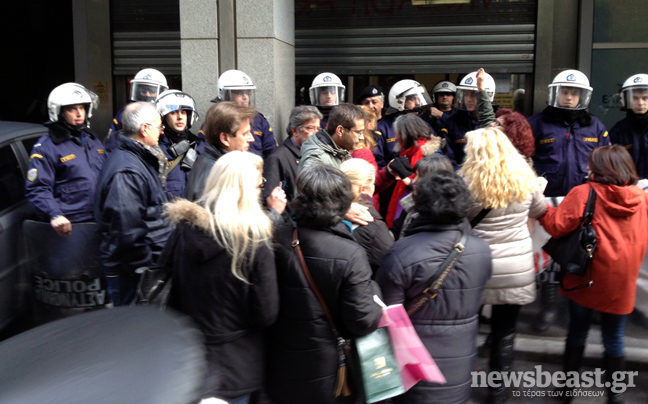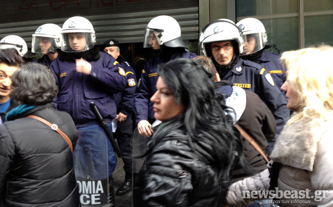 Οι απολυμένες καθαρίστριες που ζητούν την επαναπρόσληψή τους φωνάζουν συνθήματα κατά της τρόικας και της κυβέρνησης.