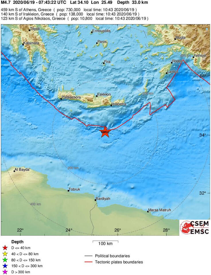 Ο σεισμός σημειώθηκε 65 χλμ νότια της Άρβης Ηρακλείου και είχε εστιακό βάθος μόλις 4,9 χλμ.