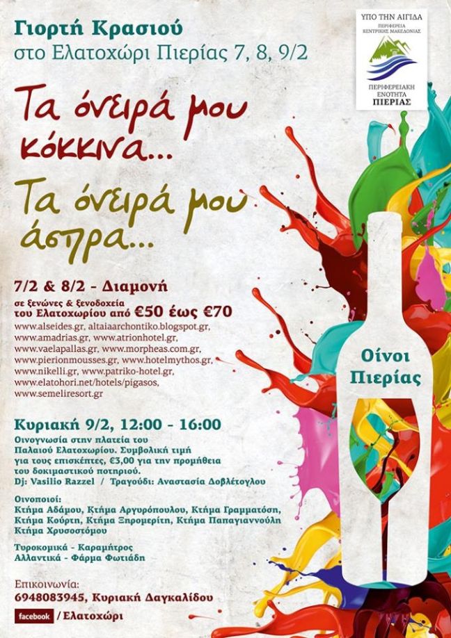 Η «Γιορτή Κρασιού» είναι μια προσπάθεια της ομάδας νέων του Ελατοχωρίου (YPP) και του συλλόγου επαγγελματιών του χωριού και τελεί υπό την αιγίδα της Αντιπεριφέρειας Πιερίας, είπε στο ΑΠΕ-ΜΠΕ το μέλος της YPP Κυριακή Δαγκαλίδου.