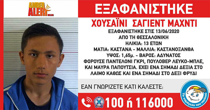 Το αγόρι εξαφανίστηκε στις 13/6/2020 και ώρα 17:30 από την Θεσσαλονίκη. Το όνομα του είναι Χουσαΐνι (επ.) Σαγιέντ Μαχντί (ον.) και είναι μόλις 13 ετών, αφγανικής καταγωγής.