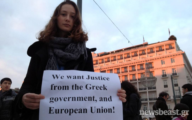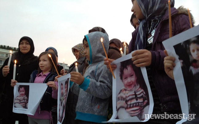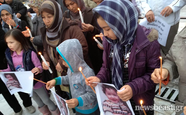 Οι παρευρισκόμενοι κρατούν κεριά και χαρτιά με συνθήματα στα ελληνικά, στα αγγλικά και στα αραβικά.
