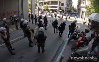 Ένταση επικράτησε έξω από το υπουργείο Οικονομικών και συγκεκριμένα στην οδό Νίκης, όταν τα ΜΑΤ πήγαν να σταματήσουν τους διαδηλωτές από το χώρο της υγείας και της καθαριότητας, οι οποίοι ζητούν -μεταξύ άλλων- την ένταξή τους στα βαρέα και ανθυγιεινά.