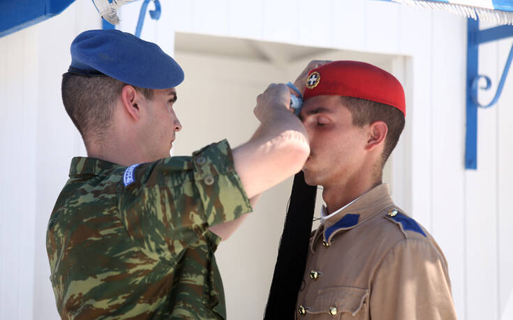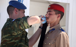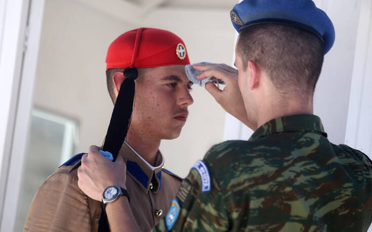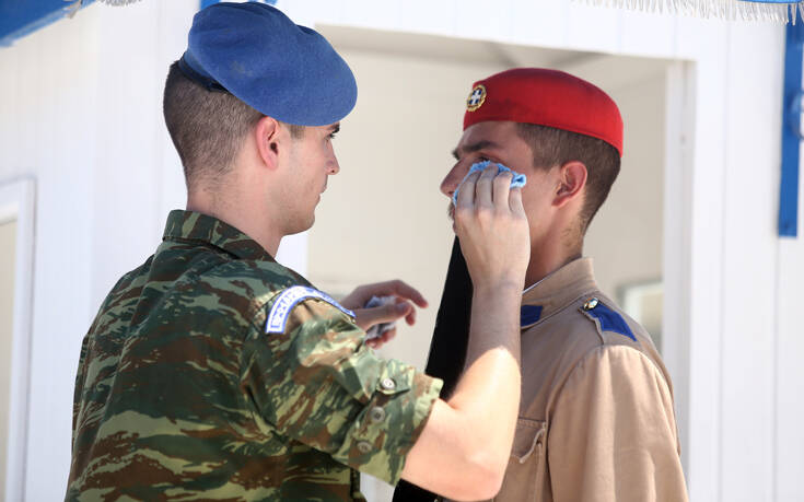 Ο φωτογραφικός φακός κατέγραψε τον αξιωματικό υπηρεσίας να σκουπίζει τον ιδρώτα ενός από αυτούς, καθώς ο ίδιος οφείλει να παραμένει ακίνητος, παρά τις συνθήκες που επικρατούν.