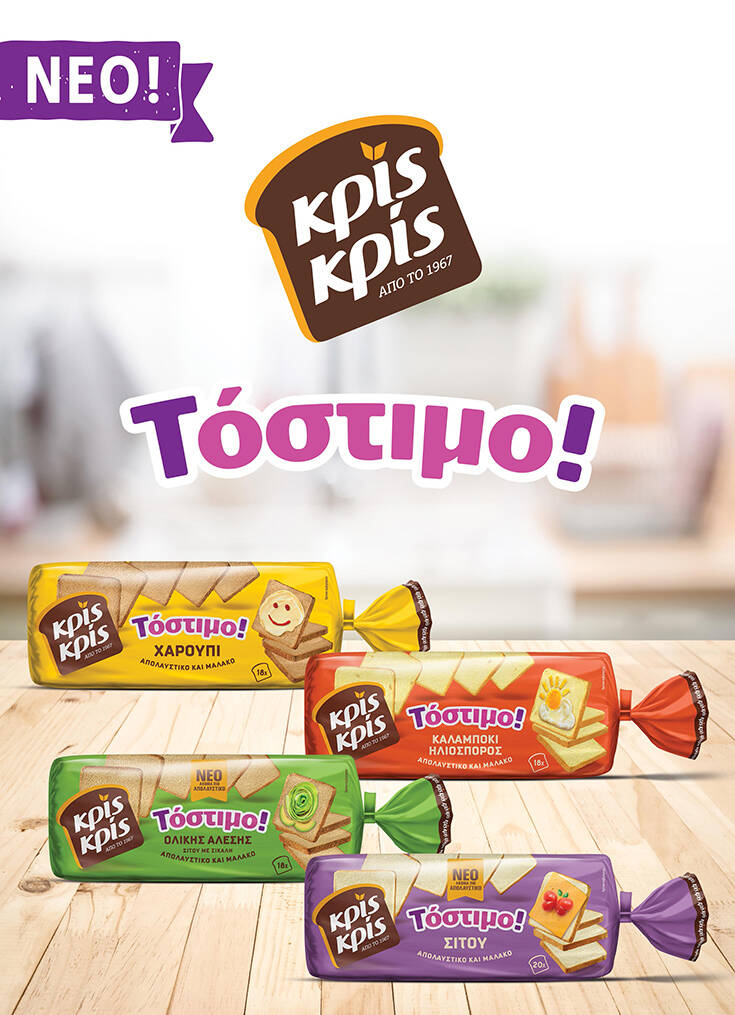 Το Κρίς Κρίς επαναλανσάρει τη σειρά Τόστιμο με νέα, πιο απολαυστική συνταγή για ακόμα πιο αφράτες και μαλακές φέτες ψωμιού τόσο στις ήδη υπάρχουσες γεύσεις Κρις Κρίς Τόστιμο Σίτου & Κρίς Κρίς Τόστιμο Ολικής Άλεσης, όσο και στις 2 νέες, ξεχωριστές γεύσεις.
