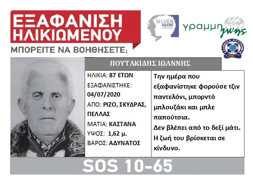Πρόκειται για τον Πουτακίδη Ιωάννη, ηλικίας 87 ετών. Την ημέρα που εξαφανίστηκε φορούσε τζιν παντελόνι, μπορντό μπλουζάκι και μπλε παπούτσια.