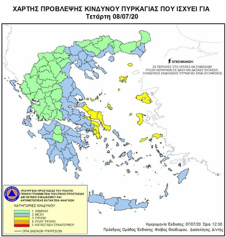 Σύμφωνα με τον Χάρτη Πρόβλεψης Κινδύνου Πυρκαγιάς που εκδίδει η Γενική Γραμματεία, για σήμερα Τετάρτη 8 Ιουλίου 2020, προβλέπεται υψηλός κίνδυνος πυρκαγιάς (κατηγορία κινδύνου 3) σε Αττική, Εύβοια, Σποράδες, Σαμοθράκη, Λήμνο, Λέσβο, Χίο, Σάμο & Ικαρία.