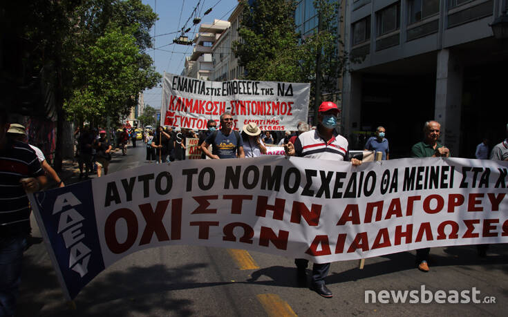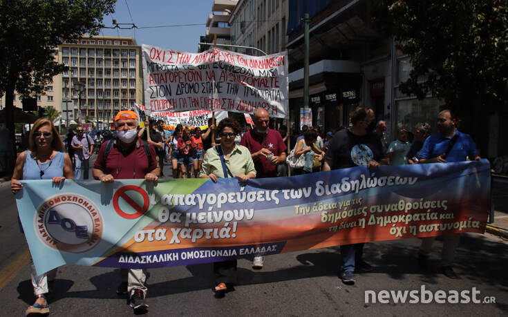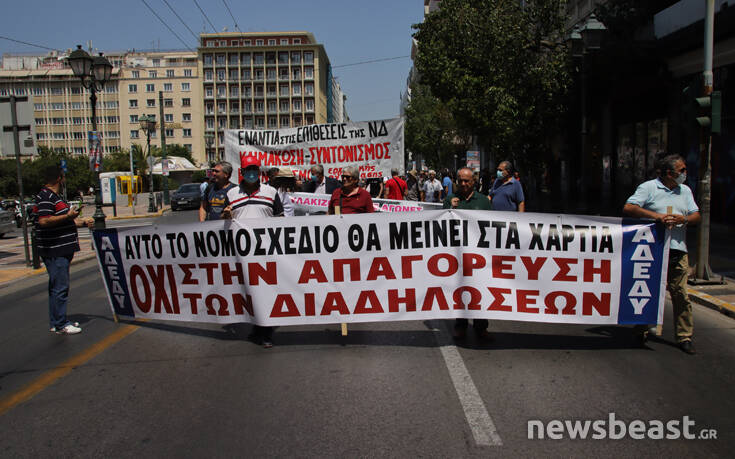 «Αυτό το νομοσχέδιο θα μείνει στα χαρτιά. Όχι στην απαγόρευση των διαδηλώσεων» γράφει το πανό της ΑΔΕΔΥ, που αυτή τη στιγμή βρίσκεται στη Σταδίου με τελικό προορισμό τη Βουλή.