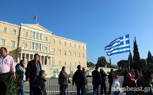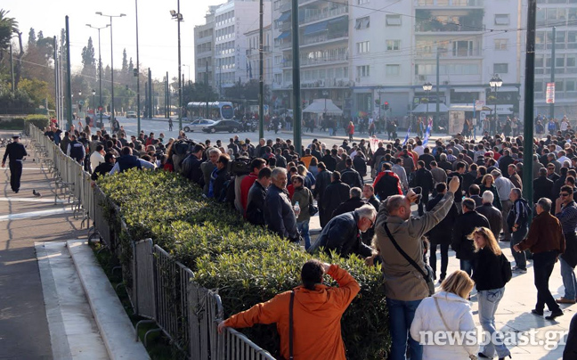 Στο Σύνταγμα, έξω από τη Βουλή, έφθασε η πορεία των αγροτών, οι οποίοι νωρίτερα πραγματοποίησαν συλλαλητήριο στην πλατεία Βάθη.
