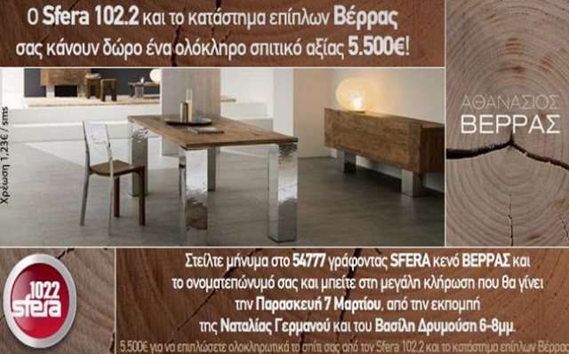 Ο Sfera 102,2 και το κατάστημα επίπλων Βέρρας σας κάνουν δώρο έπιπλα δικής σας επιλογής αξίας 5.500 ευρώ!