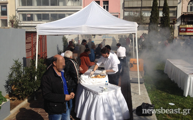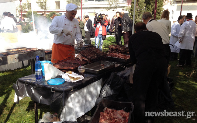 Οι κρεοπώλες της Βαρβακείου συνεχίζουν και φέτος την παράδοση των τελευταίων ετών και μοιράζουν ψημένο κρέας στους περαστικούς στην πλατεία Κοτζιά.
