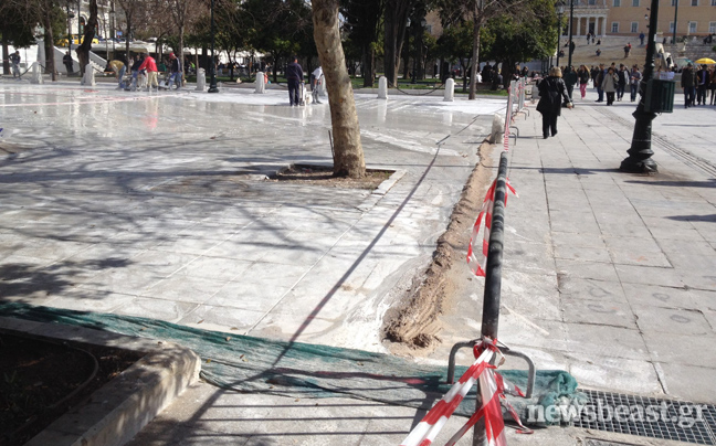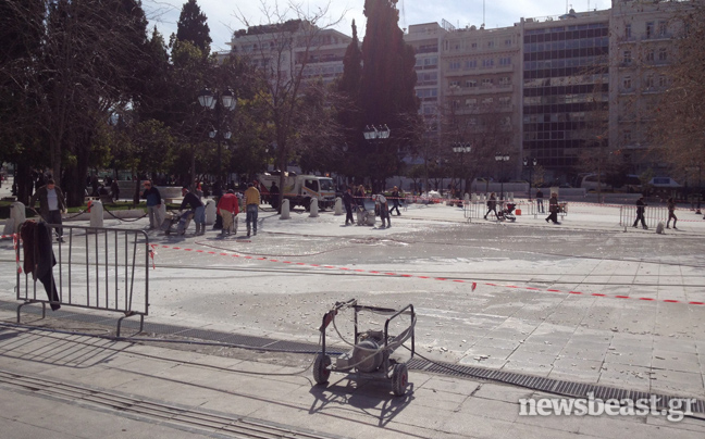 Τα επεισόδια που αμαύρωσαν τις ογκώδεις διαδηλώσεις άφησαν πίσω τους εκτεταμένες ζημιές στα μάρμαρα, τα σιντριβάνια, τα παγκάκια και τα σκαλοπάτια της πλατείας Συντάγματος που πολλές φορές μετατράπηκε σε πεδίο μάχης. Αυτές τις ζημιές από τις βόμβες μολότοφ, τον πετροπόλεμο και τα χημικά προσπαθεί τώρα να αποκαταστήσει ο Γιώργος Καμίνης δίνοντας σχετική εντολή στα συνεργεία του Δήμου Αθηναίων, λίγους μόλις μήνες πριν τις αυτοδιοικητικές εκλογές του Μαΐου.
