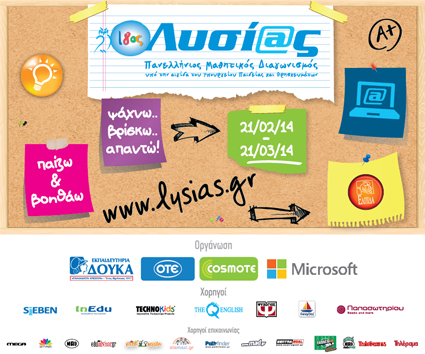 Ο ΟΤΕ και η COSMOTE υποστηρίζουν και φέτος τον Πανελλήνιο Μαθητικό Διαγωνισμό «Λυσίας 2014» (www.lysias.gr) και στέκονται δίπλα στους Έλληνες μαθητές που βιώνουν τις αξίες της ευγενούς άμιλλας, της συνεργασίας και της ομαδικότητας, που προάγει ο διαγωνισμός.