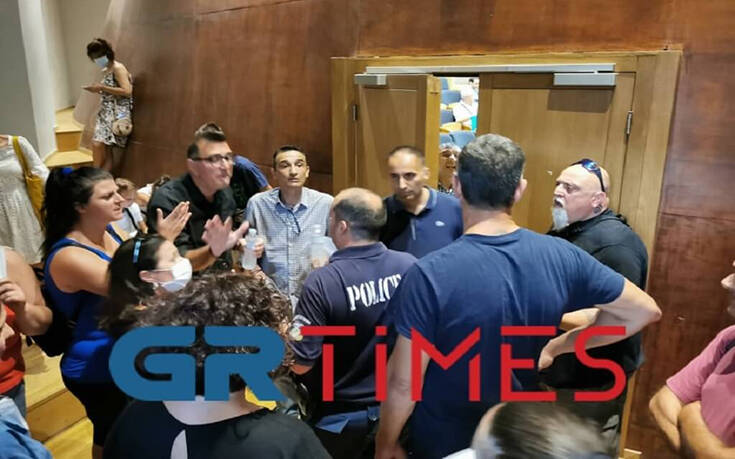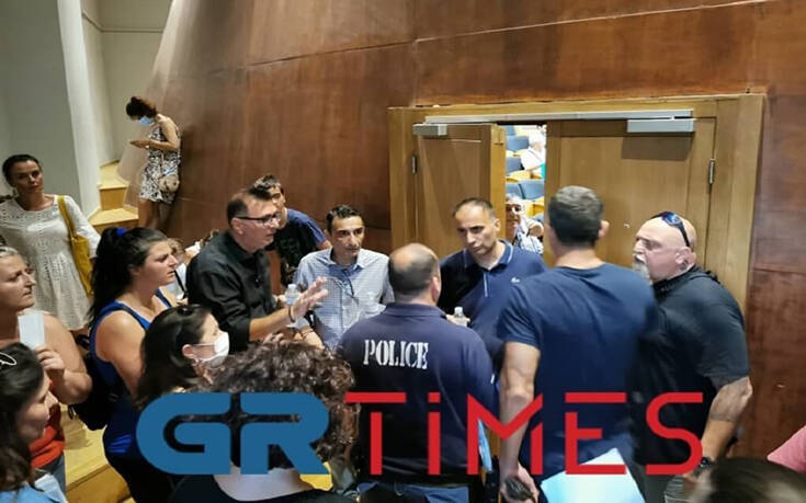 Ένταση επικράτησε έξω από την αίθουσα του δημοτικού συμβουλίου της Καλαμαριάς, κατά τη διάρκεια διαμαρτυρίας γονέων για τα σχολεία.