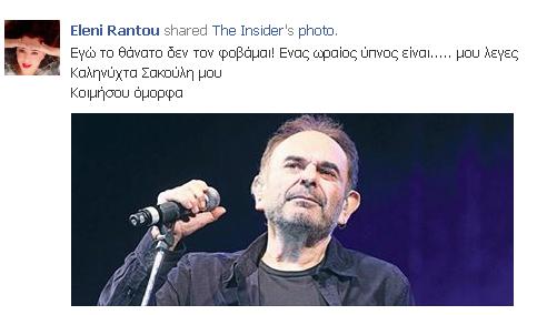 Με ένα σύντομο αλλά πολύ συγκινητικό μήνυμα, η Ελένη Ράνου αποχαιρέτησε και μέσω του Facebook τον φίλο και συνάδελφό της, Σάκη Μπουλά, που έφυγε από τη ζωή.