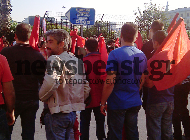 Πριν λίγο κατέβηκαν στον Πειραιά και μέλη του ΚΚΕ που ενώθηκαν με τα μέλη του ΠΑΜΕ και τους απεργούς ναυτεργάτες.