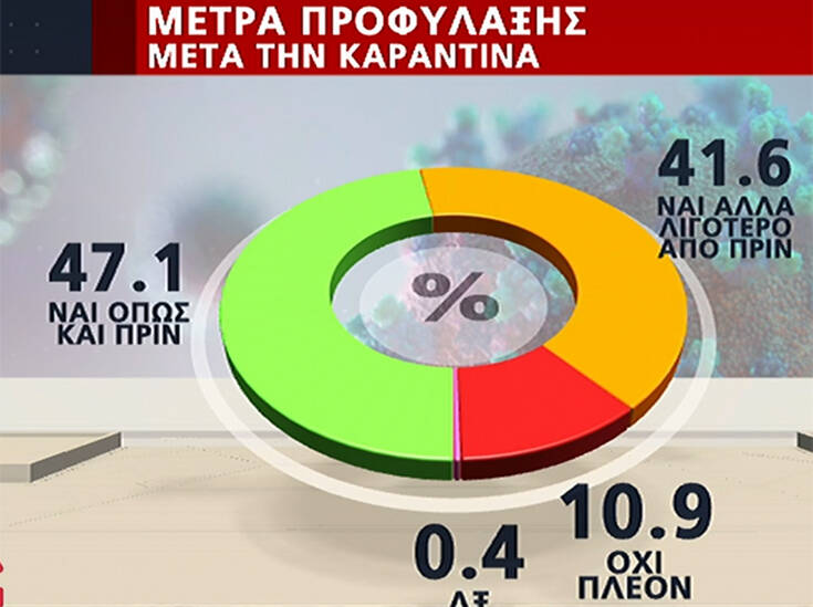 Συγκεκριμένα το 47,1% απάντησε πως τηρεί τα ίδια μέτρα προφύλαξης όπως και πριν, δηλαδή κατά την περίοδο της καραντίνας. Το 41,6% απάντησε πως ναι μεν τηρεί τα μέτρα αλλά λιγότερο από πριν και το 10,9% απάντησε πως δεν τηρεί τα μέτρα.