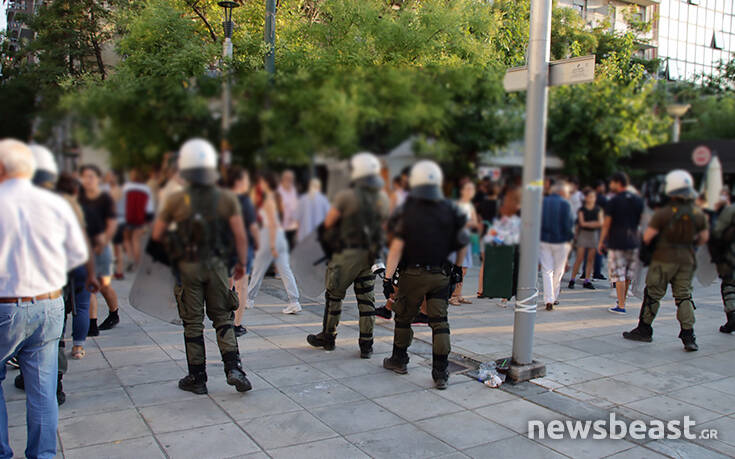 Τα ΜΑΤ απομάκρυναν μεμονωμένους πολίτες από την αντιφασιστική – αντιρατσιστική πορεία, που ξέμειναν πάνω στην πλατεία, με τους τόνους να ανεβαίνουν, όμως σε βαθμό που η κατάσταση δεν ξέφυγε, αντιθέτως με όσα συνέβησαν έξω από την ΑΣΟΕΕ.