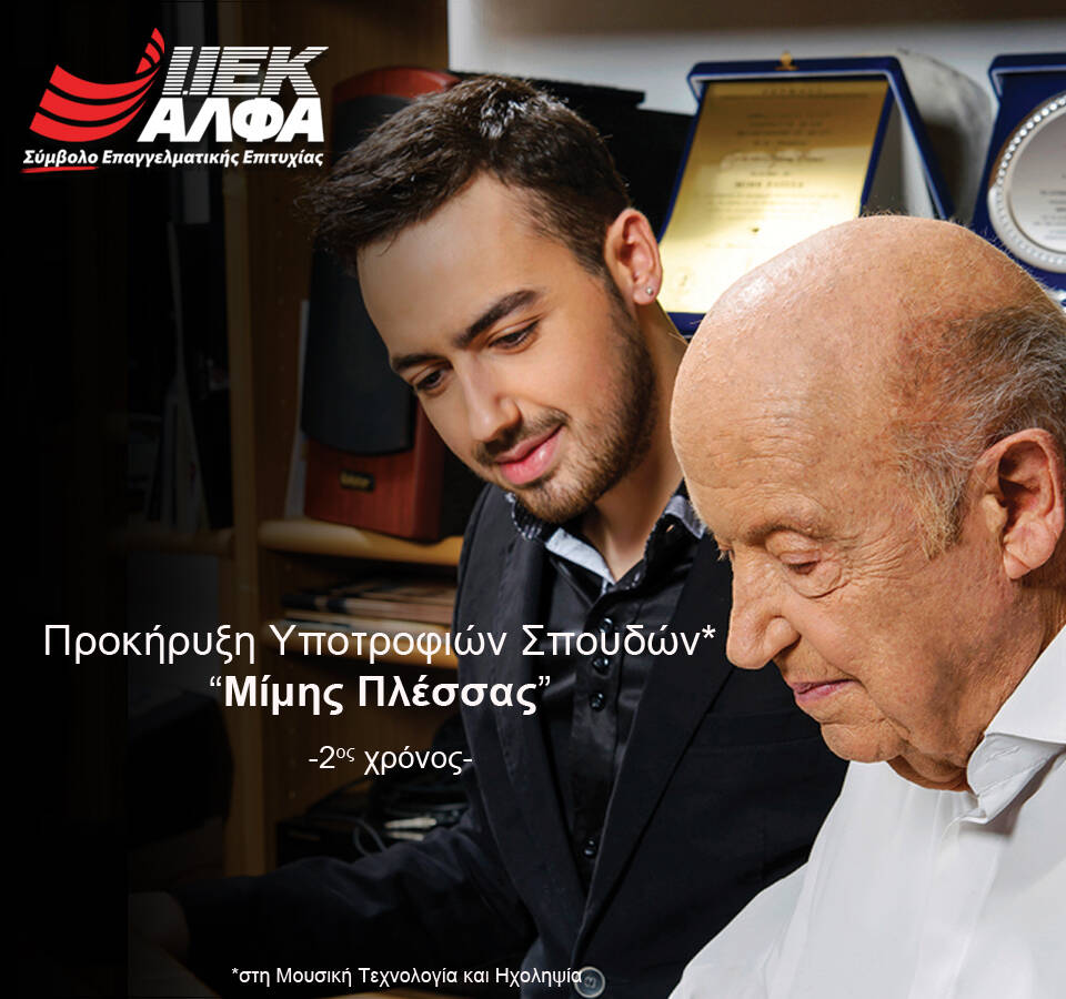 Πρωτοπόρο επί σειρά ετών στην παροχή υποτροφιών σε χιλιάδες νέους της χώρας μας, το ΙΕΚ ΑΛΦΑ προκηρύσσει -για 2η συνεχή χρονιά φέτος- τις «Υποτροφίες Μίμης Πλέσσας», για σπουδές στα νέα τμήματα Μουσικής Τεχνολογίας & Ηχοληψίας 2020-2021. Πρόκειται για έναν θεσμό που στέφθηκε πέρυσι με απόλυτη επιτυχία, αφιερωμένο στον κορυφαίο δημιουργό, Μίμη Πλέσσα! Ένα όνομα, μια ιστορία, 70 χρόνια δημιουργίας! Μια μουσική παρακαταθήκη που μεγάλωσε 3 γενιές και παραμένει διαχρονική και σύγχρονη έως τις μέρες μας!