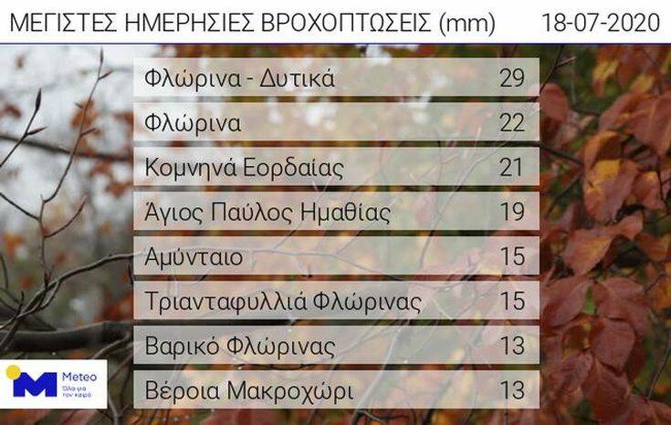 Το μεγαλύτερο ύψος βροχής καταγράφτηκε στον μετεωρολογικό σταθμό της Φλώρινας (δυτικά της πόλης) με 29 mm. Σύμφωνα με το δίκτυο αυτόματων μετεωρολογικών σταθμών του Εθνικού Αστεροσκοπείου Αθηνών/Meteo.gr, τα οκτώ μεγαλύτερα ύψη βροχής έως και το απόγευμα του Σαββάτου 18/07 καταγράφονται στον Πίνακα 1.