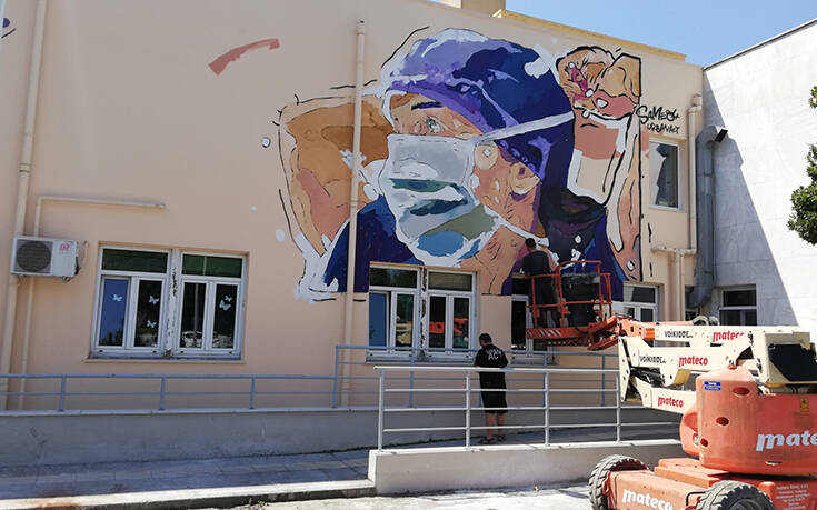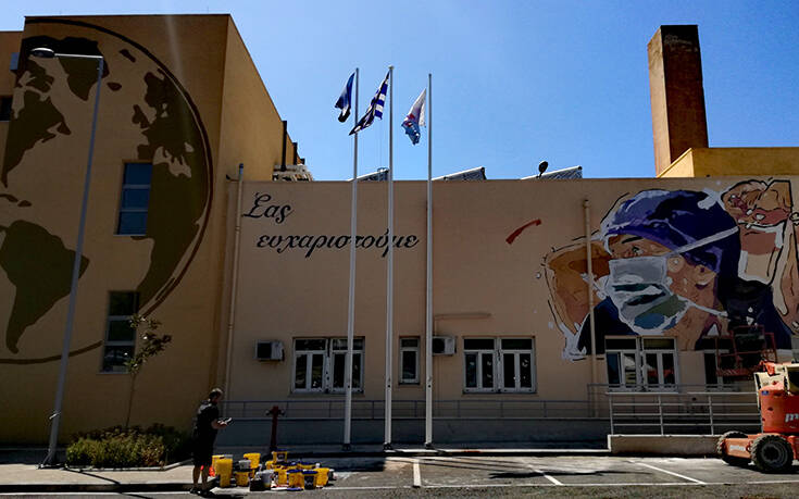 Ένα μεγάλο και εντυπωσιακό γκράφιτι «κοσμεί» την πρόσοψη του νοσοκομείου ΑΧΕΠΑ. Το γκράφιτι αναπαριστά έναν καταπονημένο νοσηλευτή με μάσκα και ακριβώς δίπλα υπάρχει το μήνυμα «Σας ευχαριστούμε».