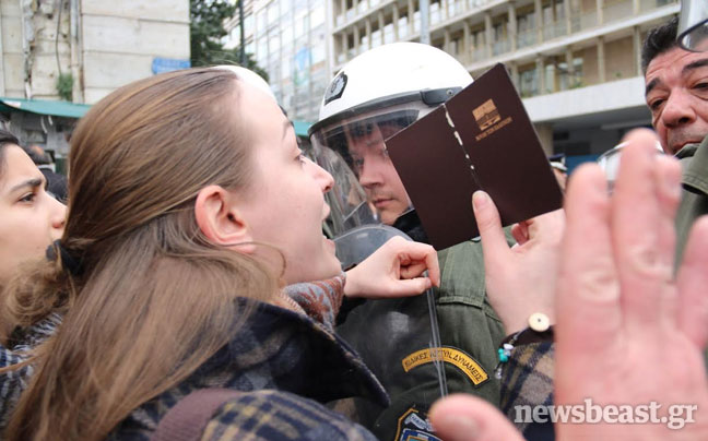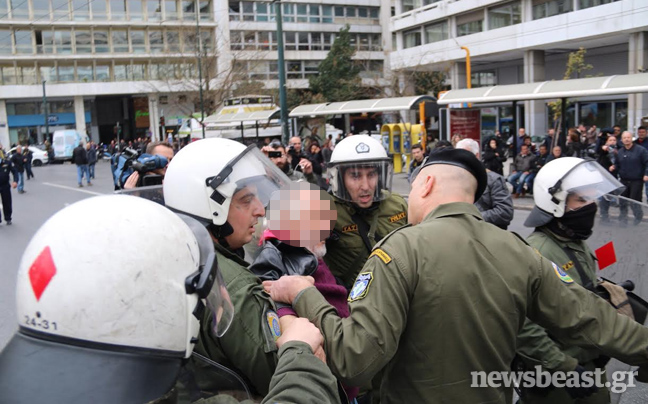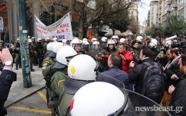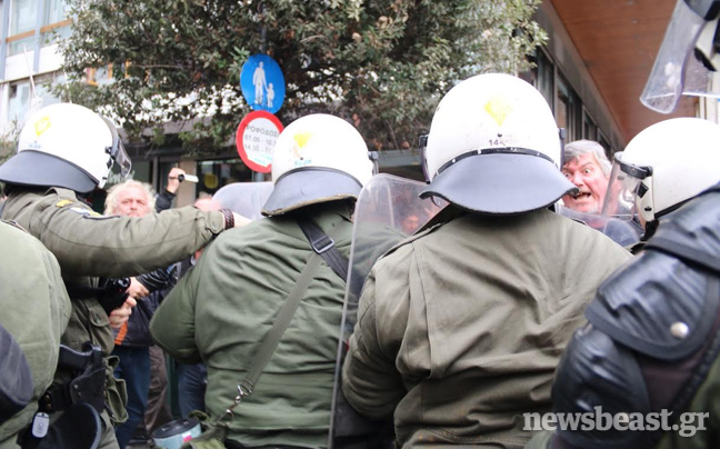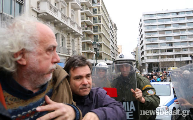 Οι διμοιρίες των ΜΑΤ προσπαθούν να απομακρύνουν τους διαδηλωτές για να φύγει η τρόικα.