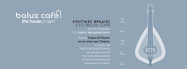 Ένα άλλο μοναδικό γευστικό event ξεκινά επίσης, με τίτλο «Η Κρήτη στο πιάτο σας», από την Τετάρτη 5 Μαρτίου και κάθε Τετάρτη έως και τις 26 Μαρτίου, στο BaluxCafé-The HouseProject.