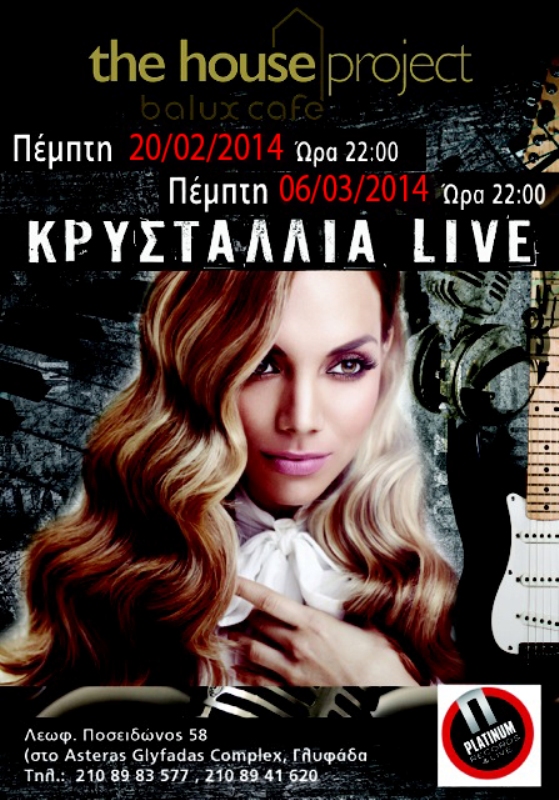 Αλλά και η Κρυσταλλία Ρήγα μας επιφυλάσσει μία ακόμα ξεχωριστή εμφάνιση την Πέμπτη 6 Μαρτίου! Η σκηνή του BaluxCafé-The HouseProject θα πλημμυρίσει τη ζεστή φωνή της εκκεντρικής τραγουδίστριας που εκπλήσσει σε κάθε της εμφάνιση!