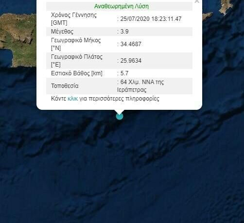 Η ακριβής τοποθεσία είναι 64 χλμ. Νοτιοανατολικά της Ιεράπετρας και το εστιακό βάθος είναι 5,7 χλμ.