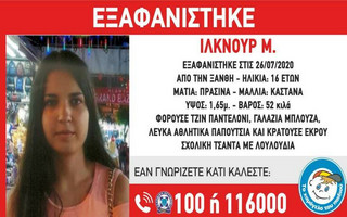 Πιο συγκεκριμένα, το Χαμόγελο του Παιδιού ενημερώνει ότι «στις 26/7/2020, στις 07:00, εξαφανίστηκε από το σπίτι της στην περιοχή της Ξάνθης, η Ιλκνούρ Μ., 16 ετών. Η Ιλκνούρ Μ.έχει ύψος 1,65 μ., 52 κιλά βάρος, καστανά μαλλιά και πράσινα μάτια.