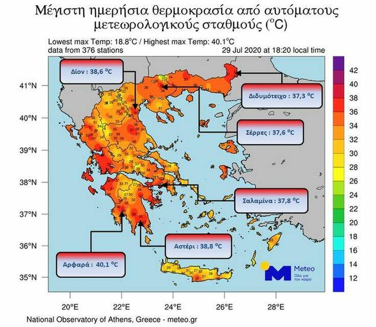 Σε πολύ υψηλά επίπεδα, όπως αναμενόταν, ανήλθαν οι μέγιστες θερμοκρασίες τις μεσημεριανές ώρες της Τετάρτης 29/07 σχεδόν στο σύνολο της χώρας, με τη μεγαλύτερη τιμή να καταγράφεται στα Αρφαρά Μεσσηνίας όπου ο υδράργυρος έφτασε στους 40,1 βαθμούς. Στο χάρτη που ακολουθεί αποτυπώνονται οι μέγιστες θερμοκρασίες που καταγράφηκαν στη χώρα από το δίκτυο αυτόματων μετεωρολογικών σταθμών του Εθνικού Αστεροσκοπείου Αθηνών/meteo.gr, ενώ επισημαίνονται επιλεκτικά κάποιες από αυτές.