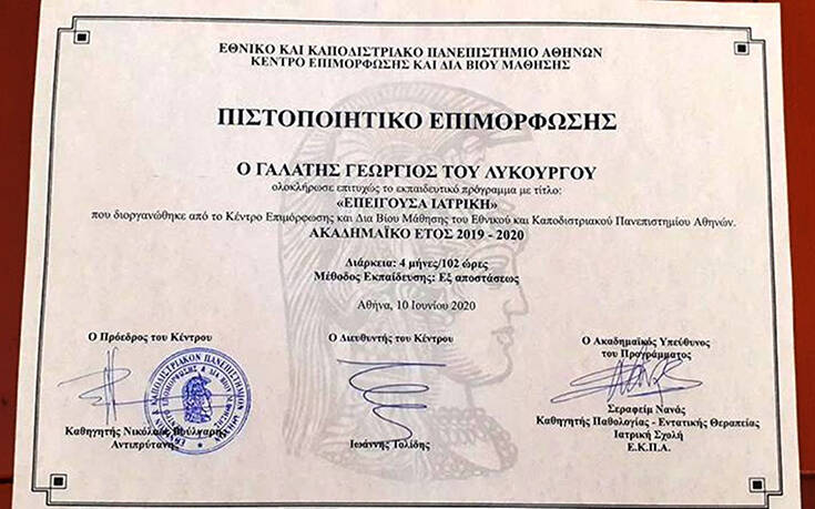 Ο ακούραστος Γιώργος Γαλάτης στο διάστημα από 29 Οκτωβρίου 2019 έως και 23 Μαρτίου 2020 παρακολούθησε επιτυχώς με τη μέθοδο της εξ αποστάσεως εκπαίδευσης και από το Κέντρο Επιμόρφωσης δια Βίου Μάθησης του Εθνικού Καποδιστριακού Πανεπιστημίου Αθηνών το επιμορφωτικό πρόγραμμα με τίτλο «Επείγουσα Ιατρική».