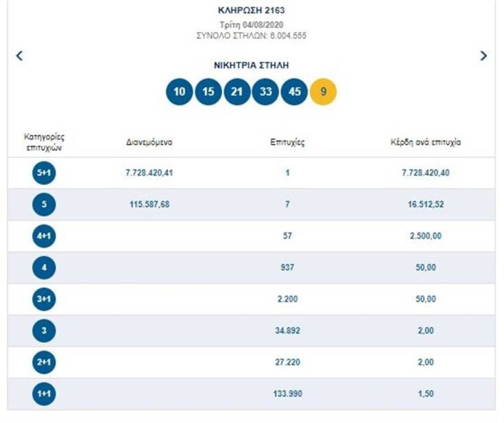 Σήμερα, 4 Αυγούστου 2020, στην κλήρωση Τζόκερ 2163 του ΟΠΑΠ, θα μοιραστούν στους τυχερούς της πρώτης κατηγορίας πάνω από 7.500.000 ευρώ.