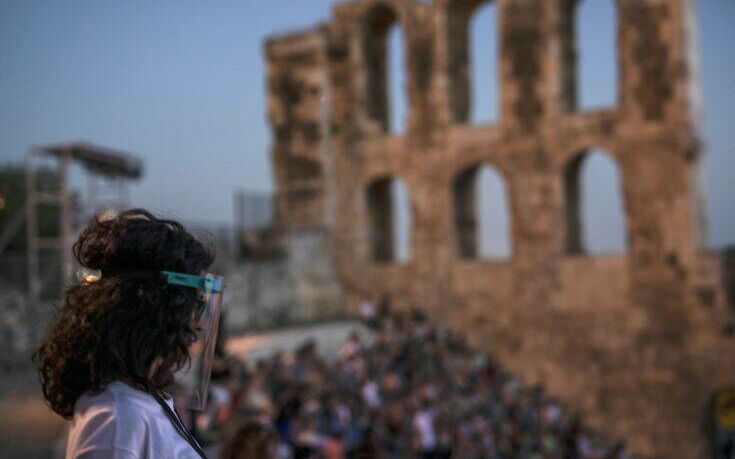 A steward wearing a plastic visor stands at the Odeon of Herodes Atticus in Athens, during a concert ,on Wednesday, July 15, 2020. Seating limits have been imposed at the renovated ancient stone Roman theater, underneath the Acropolis, as part of the restrictions due to the COVID-19 pandemic. (AP Photo/Petros Giannakouris)