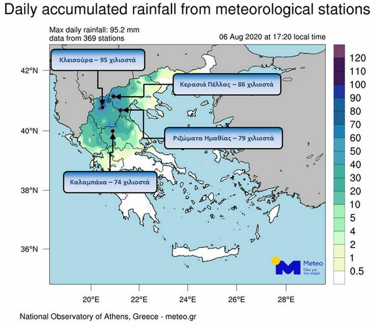 Χθες Πέμπτη 6 Αυγούστου τα μεγαλύτερα ύψη βροχής έπεσαν στη Δυτική Μακεδονία και στους νομούς Πέλλας, Ημαθίας και Τρικάλων σύμφωνα με το δίκτυο αυτόματων μετεωρολογικών σταθμών του Εθνικού Αστεροσκοπείου Αθηνών/meteo.gr.