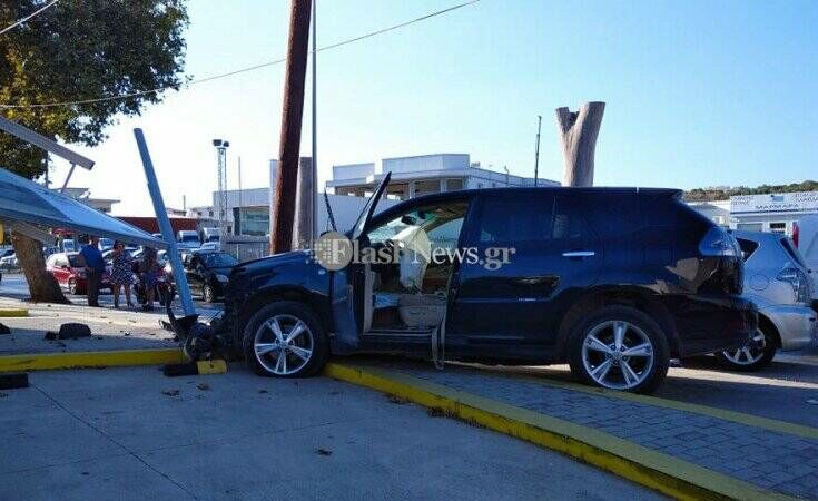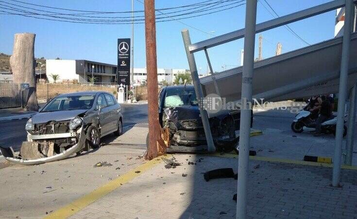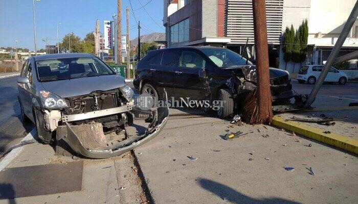 Σφοδρή σύγκρουση αυτοκινήτων σε τροχαίο ατύχημα στα Χανιά, με το ένα αμάξι να σταματάει πάνω σε κολόνα.
