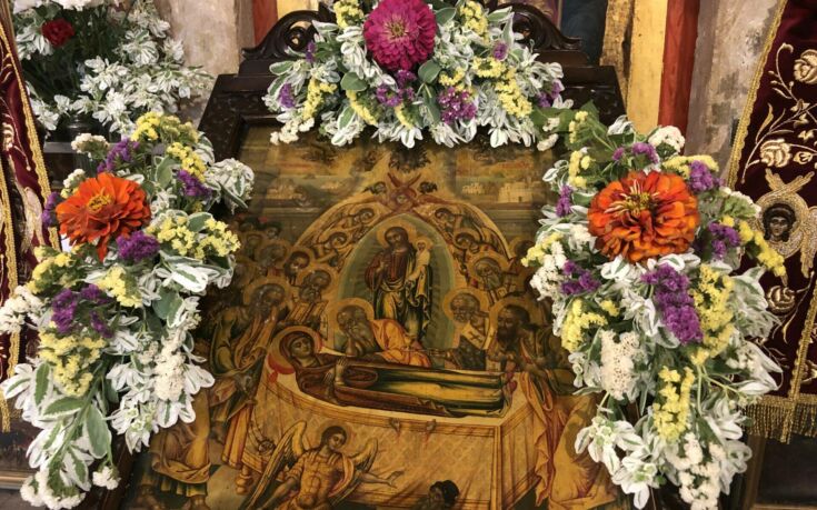 Οι επιτάφιοι της Παναγίας στολίστηκαν, από χθες το απόγευμα, με εκατοντάδες πολύχρωμες κόκκινες, ροζ, άσπρες και μπλε κορδέλες, συμβολίζοντας την Τίμια Ζώνη που έδωσε η Παναγία στους Αποστόλους. Οι κορδέλες θα μοιραστούν μετά από σαράντα μέρες στους πιστούς, για να φυλαχθούν στο εικονοστάσι του κάθε σπιτικού και να φέρουν υγεία και καλοτυχία.