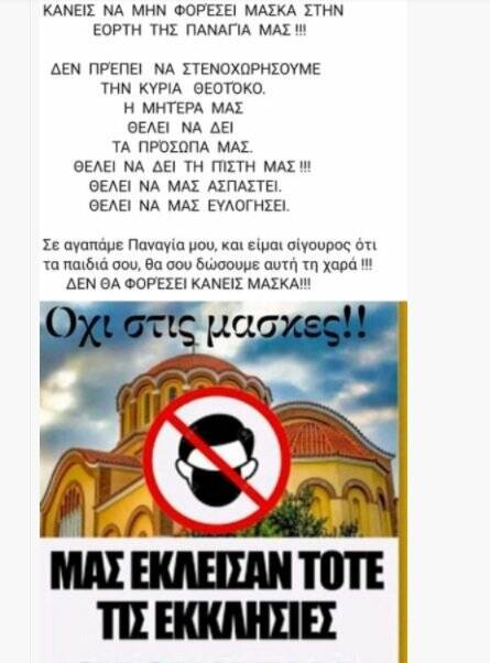 Συγκεκριμένα, ο παπάς σε ανάρτησή του ανέφερε: «ΚΑΝΕΙΣ ΝΑ ΜΗΝ ΦΟΡΈΣΕΙ ΜΑΣΚΑ ΣΤΗΝΕΟΡΤΗ ΤΗΣ ΠΑΝΑΓΊΑ ΜΑΣ !!! ΔΕΝ ΠΡΈΠΕΙ ΝΑ ΣΤΕΝΟΧΩΡΗΣΟΥΜΕ ΤΗΝ ΚΥΡΙΑ ΘΕΟΤΌΚΟ. Η ΜΗΤΈΡΑ ΜΑΣ ΘΕΛΕΙ ΝΑ ΔΕΙ ΤΑ ΠΡΌΣΩΠΑ ΜΑΣ. ΘΕΛΕΙ ΝΑ ΔΕΙ ΤΗ ΠΊΣΤΗ ΜΑΣ !!! ΘΕΛΕΙ ΝΑ ΜΑΣ ΑΣΠΑΣΤΕΙ. ΘΕΛΕΙ ΝΑ ΜΑΣ ΕΥΛΟΓΗΣΕΙ. Σε αγαπάμε Παναγία μου, και είμαι σίγουρος ότι τα παιδιά σου, θα σου δώσουμε αυτή τη χαρά !!! ΔΕΝ ΘΑ ΦΟΡΈΣΕΙ ΚΑΝΕΙΣ ΜΑΣΚΑ!!!”.