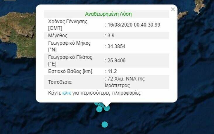 Ο σεισμός είχε μέγεθος 3,9 Ρίχτερ, με το επίκεντρό του να εντοπίζεται 72 χιλιόμετρα νοτιοανατολικά της Ιεράπετρας. Ο σεισμός είχε εστιακό βάθος 2 χιλιομέτρων.