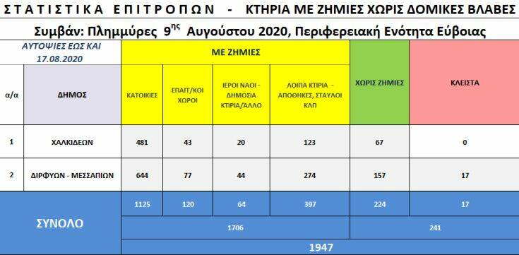 Στις πληγείσες περιοχές βρέθηκαν συνολικά 100 μηχανικοί και πραγματοποίησαν μέχρι στιγμής ελέγχους σε 1.947 κτίρια, εκ των οποίων, ζημιές έχουν υποστεί 1.706 κτίρια.