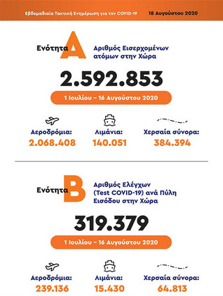 Συνολικά από τη 1η Ιουλίου μέχρι και τις 16 Αυγούστου ο αριθμός των εισερχομένων ατόμων στη χώρα ανέρχεται σε 2.592.853. Από αυτούς οι 2.068.408 εισήλθαν από τα αεροδρόμια, οι 140.051 από λιμάνια και οι 384.394 από τα χερσαία σύνορα.