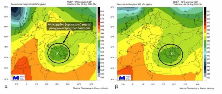 Τις πρώτες πρωινές ώρες του Σαββάτου 8 Αυγούστου 2020 το κέντρο της διαταραχής εντοπιζόταν στους χάρτες ανάλυσης στην περιοχή του Ιονίου (Σχήμα α), ενώ 12 ώρες αργότερα κινήθηκε νοτιοανατολικά πάνω από τον ηπειρωτικό κορμό της χώρας και το κέντρο του εντοπιζόταν στο Κεντρικό Αιγαίο Πέλαγος τα ξημερώματα της Κυριακής 9 Αυγούστου 2020 (Σχήμα β).