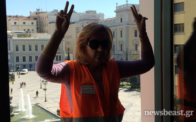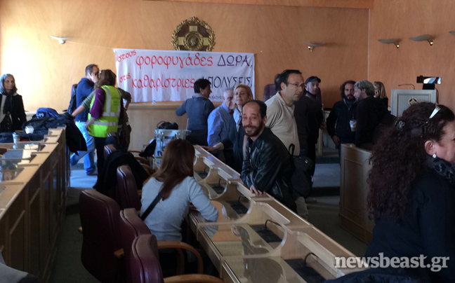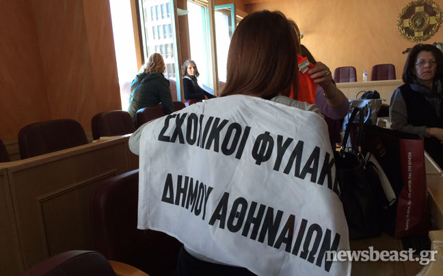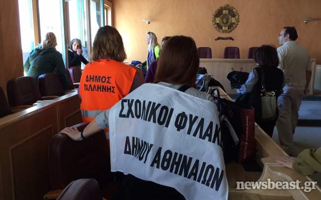 Αιφνιδιαστική κατάληψη στο δημαρχείο της Αθήνας έκαναν σχολικοί φύλακες και οι απολυμένες καθαρίστριες του υπουργείου Οικονομικών.